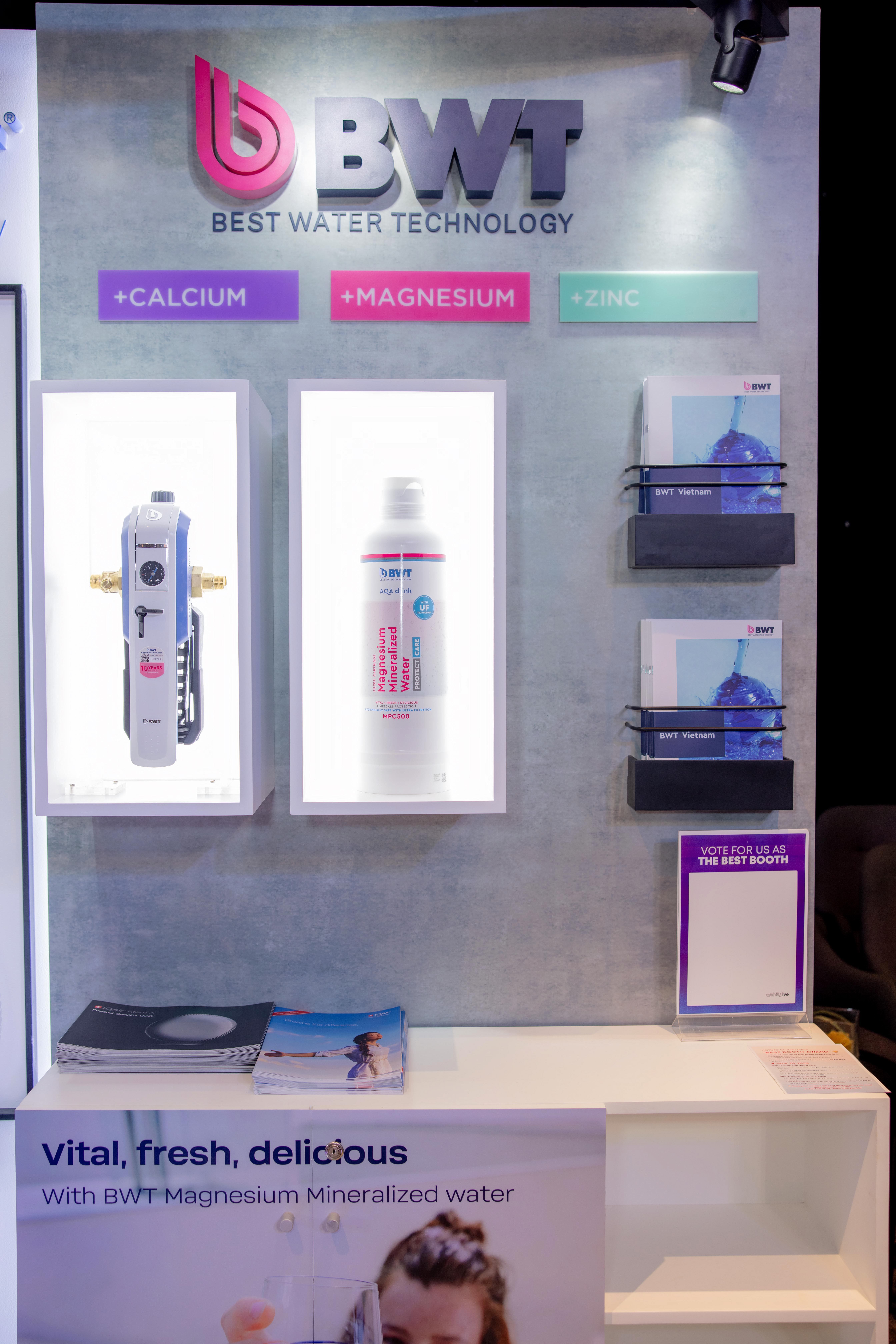 Tại gian hàng BWT, khách tham quan được trực tiếp trải nghiệm những giải pháp lọc nước cao cấp đến từ châu Âu từ hương vị tinh khiết, giàu khoáng chất cho đến thiết kế tinh gọn, sang trọng, phù hợp với nhiều phong cách sống hiện đại. Không chỉ loại bỏ tạp chất và vi sinh vật có hại, các giải pháp của BWT còn bổ sung Magie (Mg), Canxi (Ca) và Kẽm (Zn) - những khoáng chất thiết yếu đối với cơ thể, giúp duy trì xương chắc khỏe, tăng cường năng lượng, hỗ trợ hệ miễn dịch và mang lại nguồn nước tinh khiết, tốt cho sức khỏe mỗi ngày.